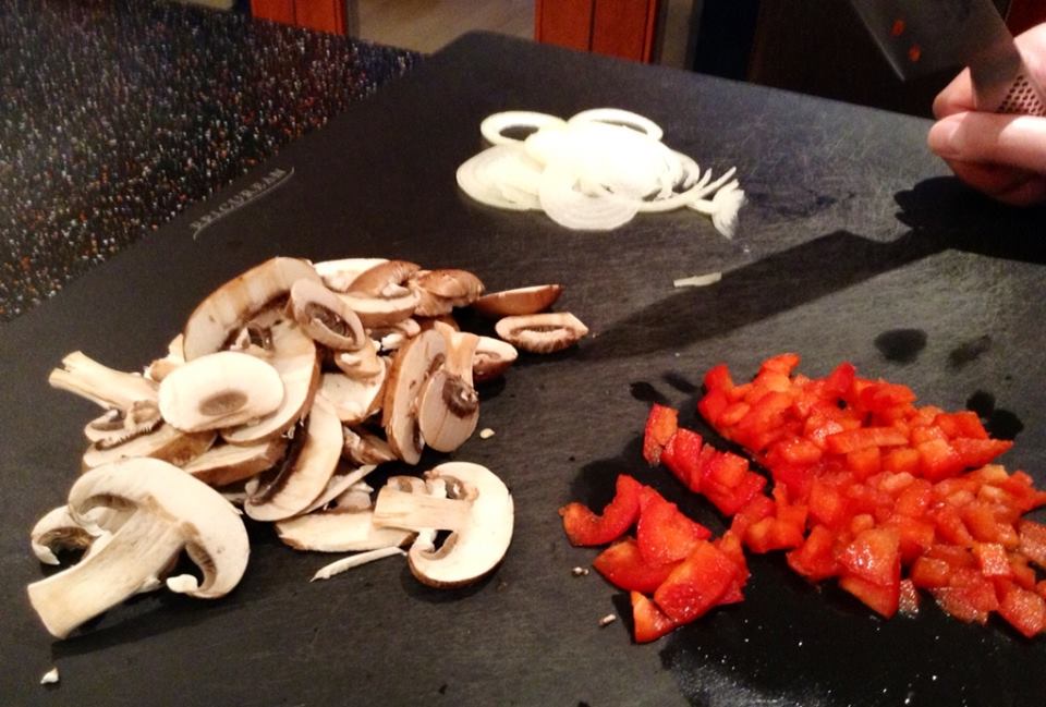 Preheat the oven to 200°C (180°C for fan-assisted ovens) / 400°F. Finely chop about two handfuls of mushrooms (I used chestnut mushrooms here), half a red pepper and half a small onion.