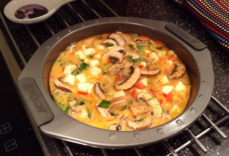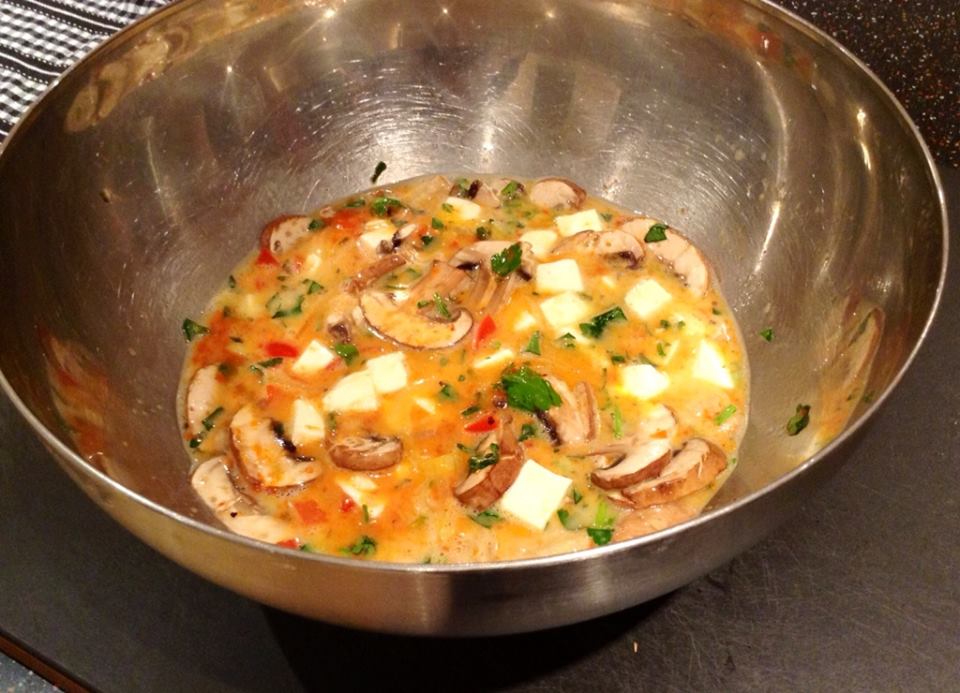 Add 125g of diced mozzarella and the sautéed onions and red peppers. Gently mix all the ingredients together. Heat some olive oil in an omelette pan, or in a pan that is oven proof (my cake pan did the trick here). Once the olive oil is hot, remove the pan from heat and pour the egg mixture into the pan.