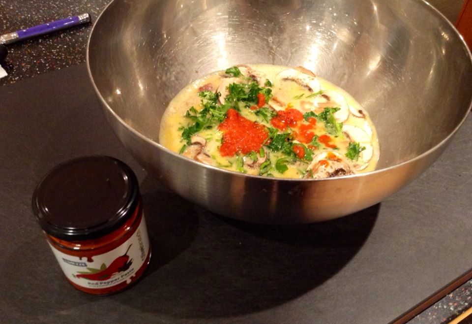 Add 1/2 teaspoon salt, a handful of chopped fresh parsley and 2 tablespoons of red pepper paste to the egg mixture. The red pepper paste is optional but I’ve recently discovered Olive Branch’s Red Pepper Paste from their Greek Mezze range and it goes particularly well with eggs. It also contains a bit of Greek cheese (mizithra) and some fresh chillies so it’s a really tasty addition to the dish. The Red Pepper Paste not only adds flavour, it also gives the frittata its beautiful colour so I highly recommend it!