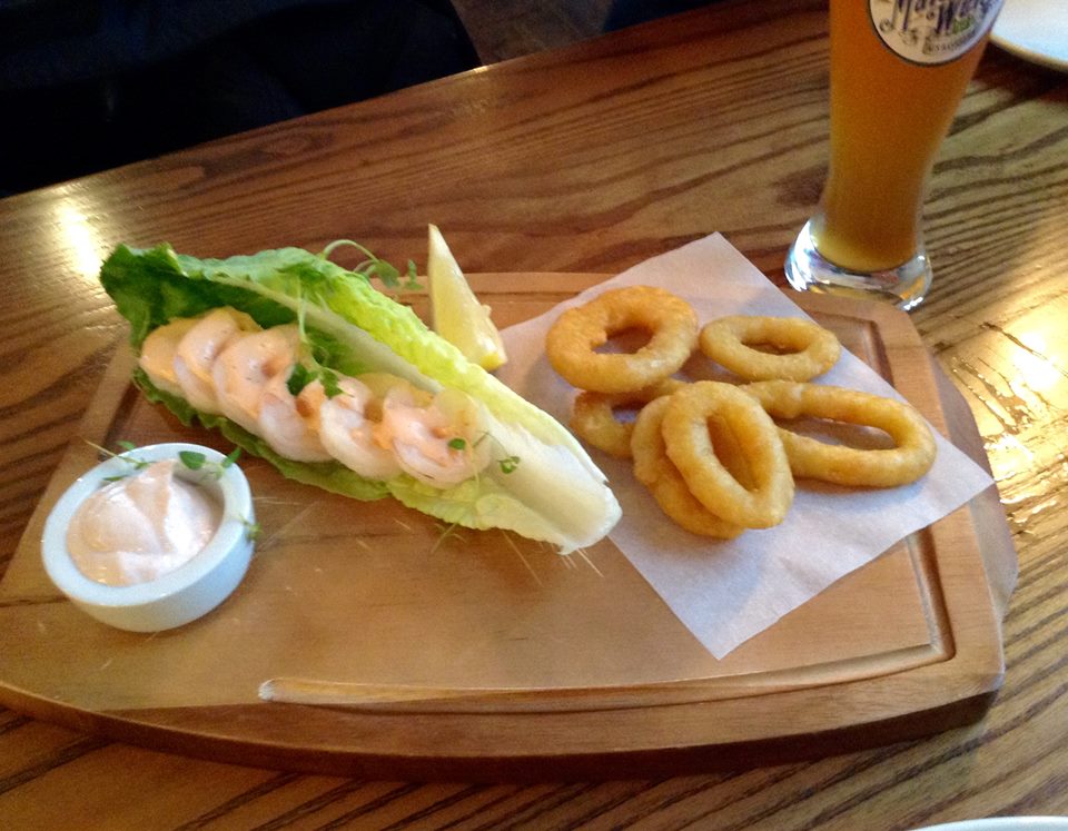 Both portions were served on one wooden board and the presentation was lovely, but it was a bit puzzling. There was no mention that the board was for two people to share so we had to ask, just in case one of the starters was forgotten. There were 6 king prawns and 6 calamari rings in total (3 of each per person). The taramasalata was in one pot but it didn’t seem like a lot of dip for two people. It was also supposed to be served with flatbreads, which would have made the dip more enjoyable but we only realised when we got home that the flatbreads were forgotten. I’m sure this would have been immediately rectified had we remembered at the time. The prawns, topped with a creamy and tangy Marie Rose sauce, were very fresh. The calamari rings were served with a lemon wedge and the batter was nicely seasoned.