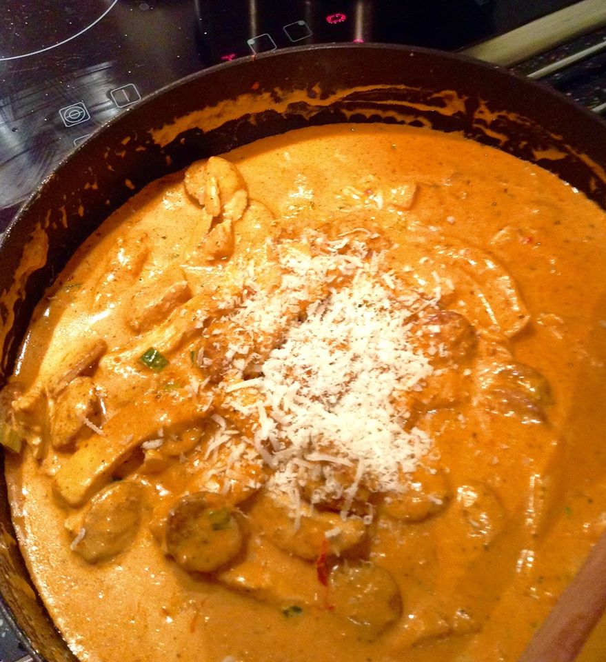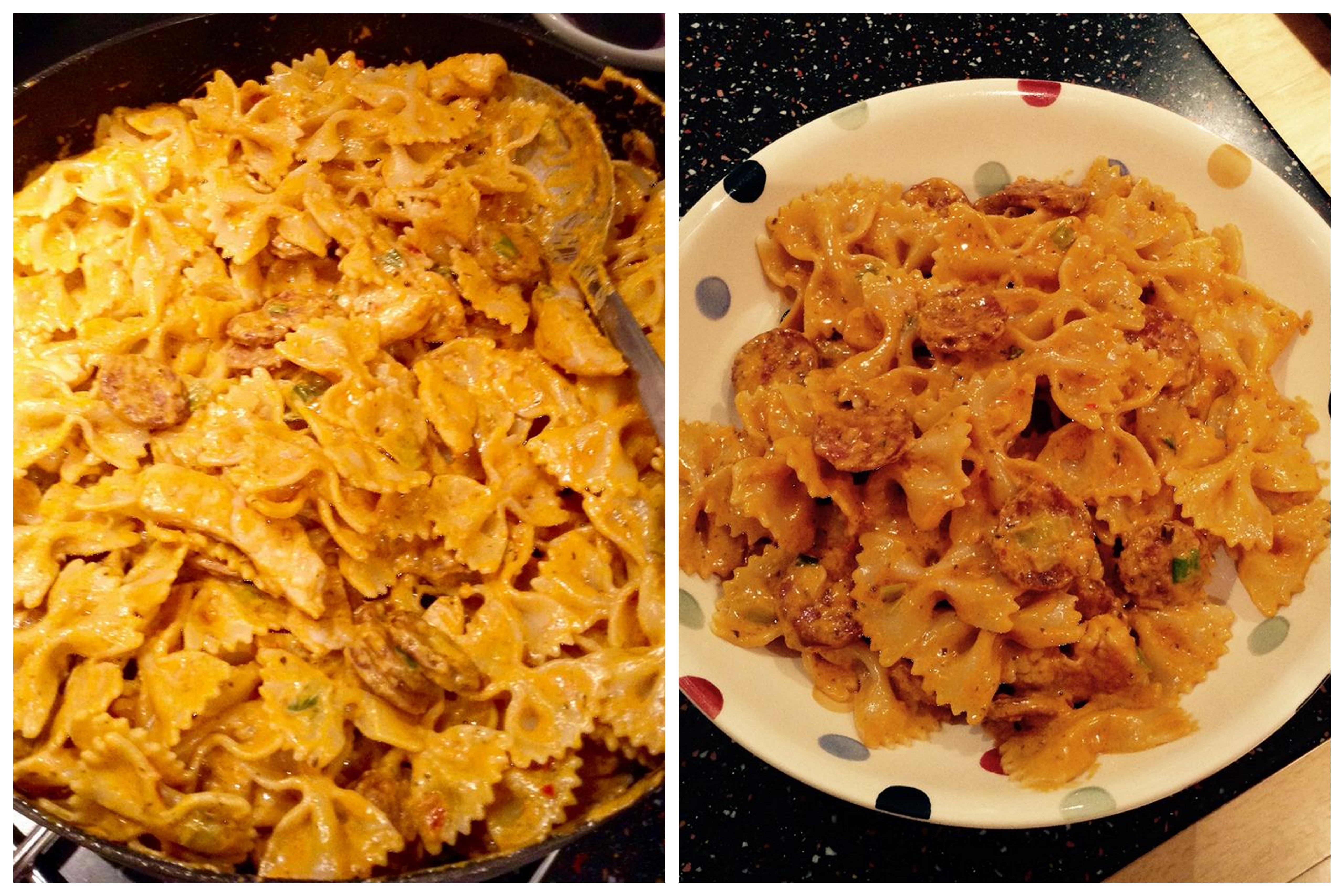 If you’ve been following my blog for a while, you may have noticed that I have an obsession a preference for pasta with cream sauces. This is another one of those dishes! The chorizo and chicken in this dish go really well together. The creamy tomato pesto sauce tames the spiciness of the chorizo and red chillis. The result is a tasty dish with a velvety texture. I used Unearthed’s Chorizo de León, which is a Spanish oak-smoked cured pork sausage with a spicy kick. I find farfalle (bow tie) pasta suits this dish best but any short, sturdy pasta will do.