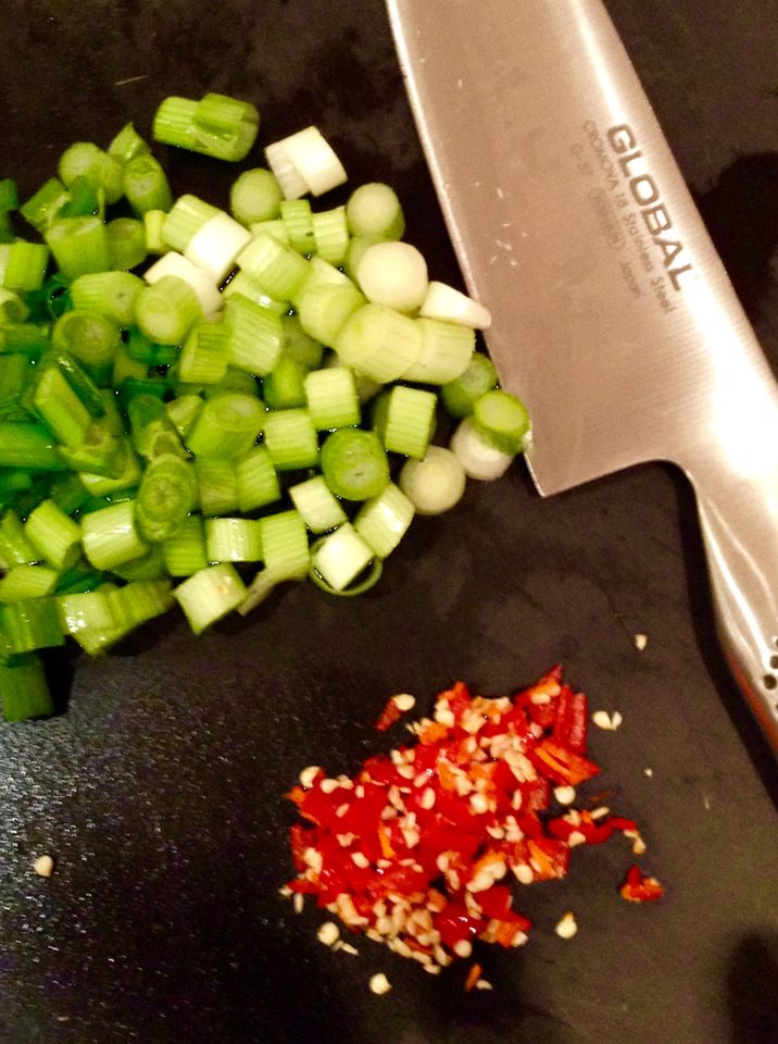 Put the chorizo back into the skillet and add the chillis and spring onions. Continue cooking and stirring all of the ingredients until the chicken is no longer pink inside.