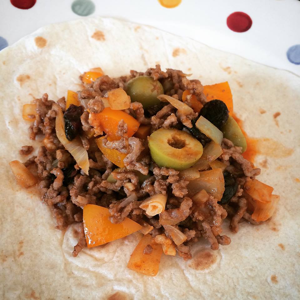 To serve, spoon picadillo into a tortilla. To wrap, fold both sides of the tortilla over the filling towards the centre then fold the bottom. Hold firmly. Don’t overfill or it will fall apart when you pick it up.