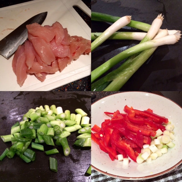 Tip the bowl with the red pepper and white part of the spring onions into the wok and stir-fry for a few more minutes.