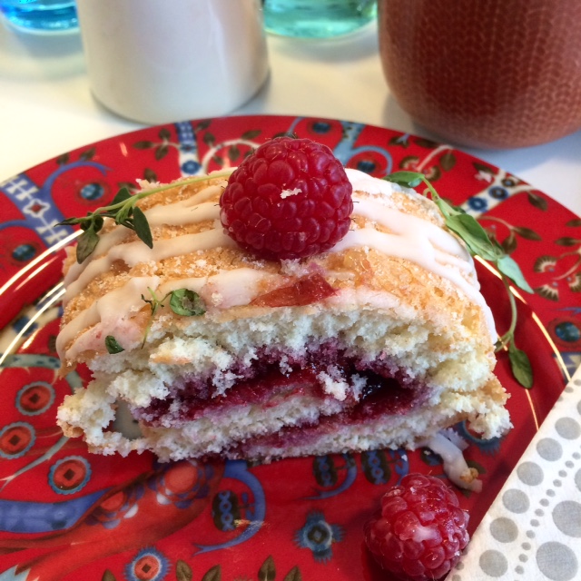 The roulade was springy and moist and the tart raspberries beautifully balanced the sweetness of the cake and icing. The accompanying raspberries and thyme provided an explosion of fresh flavours. I am still dreaming about this roulade!