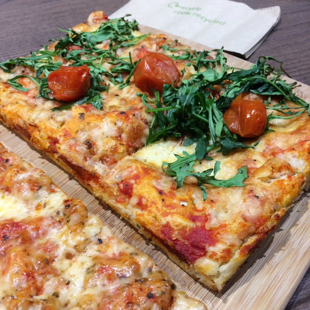 Most people are only familiar with the round single serving pizzas, sometimes baked in a wood fired oven. Signorelli’s Deli, which opened recently on Burleigh Street by The Grafton Centre, serve their pizza differently. They specialise in pizza al taglio (pizza by the slice), where the dough is spread out in a rectangular tray, topped with a choice of ingredients, baked in an electric oven and cut into slices. It’s not meant to be served hot. The rectangular slices are easy to eat on the go but Signorelli’s Deli boasts a welcoming spacious interior with some of the friendliest staff I have ever encountered. The pride and passion for what they create is apparent and they are very helpful in answering any questions about their products. There is definitely a great team there!