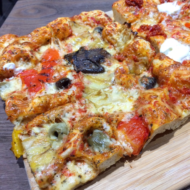 Every single one was delicious but I particularly liked the pizza topped with roasted veggies (mushrooms, red & yellow peppers, artichokes and black olives) and creamy, melty cheese.