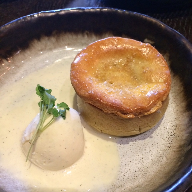 The peach pie was delightful. The soft, light pastry didn’t deter from the delicate taste of the roasted peaches and the accompanying creamy white chocolate anglaise didn’t overwhelm the pie.