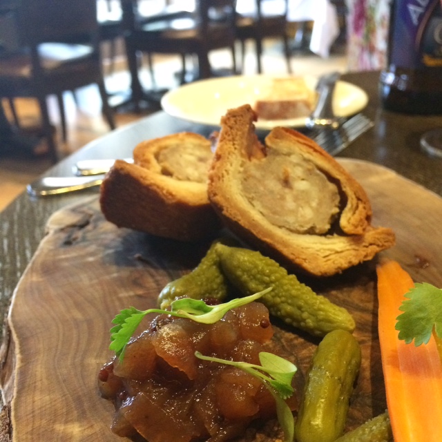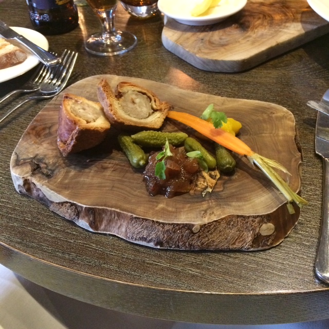 Paulo’s starter consisted of a traditional hand raised pork pie, served with Suffolk chutney and pickles. It was beautifully presented on a wooden board.