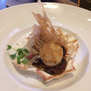 For my starter, I chose the pie with scallops, bacon and black pudding. What was served didn’t look like a pie but showed wonderful imagination. It contained all the ingredients of a pie, including filo pastry, but with a creative twist. The tasty scallop, bacon and black pudding mixture with tomato confit was served in a scallop shell and topped with crispy, light filo leaves. The whole dish really worked with the classic combination of scallops and charcuterie flavours.