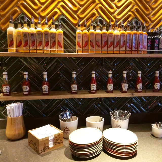 The corn on the cob’s kernels weren’t plump and well-developed. The corn had a nice flavour from the charring but it was a bit dry. The butter on the side helped though. The chips were just OK. Paulo thought the PERi-salted chips were too salty and a little disappointing. He enjoyed the garlic bread. We stuck to soft drinks (refillable glasses) but there is a drinks menu featuring wine, spritzers, beer and cider.