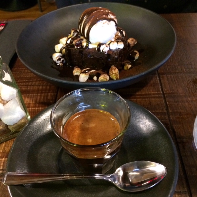 Paulo had room for dessert so he chose the Muddy Mess, a decadent chocolate brownie with marshmallows and vanilla ice cream drizzled with chocolate sauce. The bourbon flavour, as described in the menu, wasn’t noticeable. However, I had a taste and the whole dish was delicious and not overly sweet. An excellent espresso rounded out the meal.