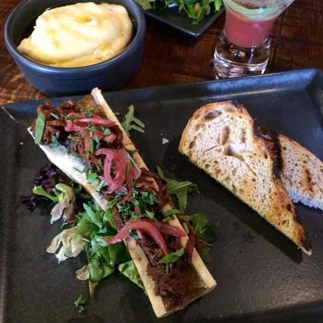 The roasted bone marrow, topped with pulled beef brisket and served with toast was a feast for the eyes and palate. There’s even an option to add a shot of bourbon, with the empty bone acting as a luge to down the bourbon (I wasn’t brave enough to try it).