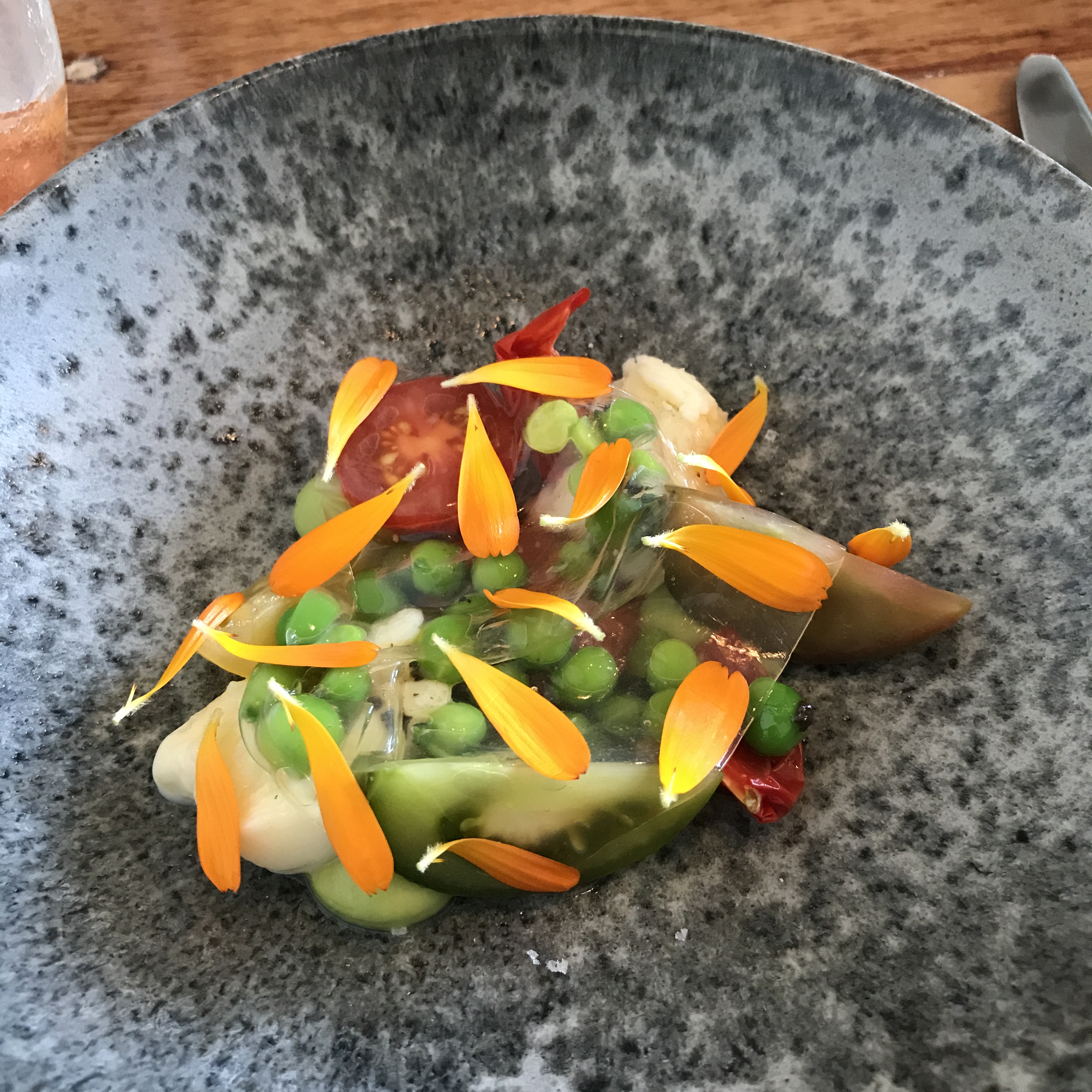This starter was freshness on a plate, graced with the most vibrant greens and reds and dotted with orange edible petals. The incredibly fresh tomatoes, peas and avocado were covered with a transparent jelly-like sheet that gave each mouthful a cool wet sensation, similar to eating freshly picked, just-rinsed fruits and vegetables.