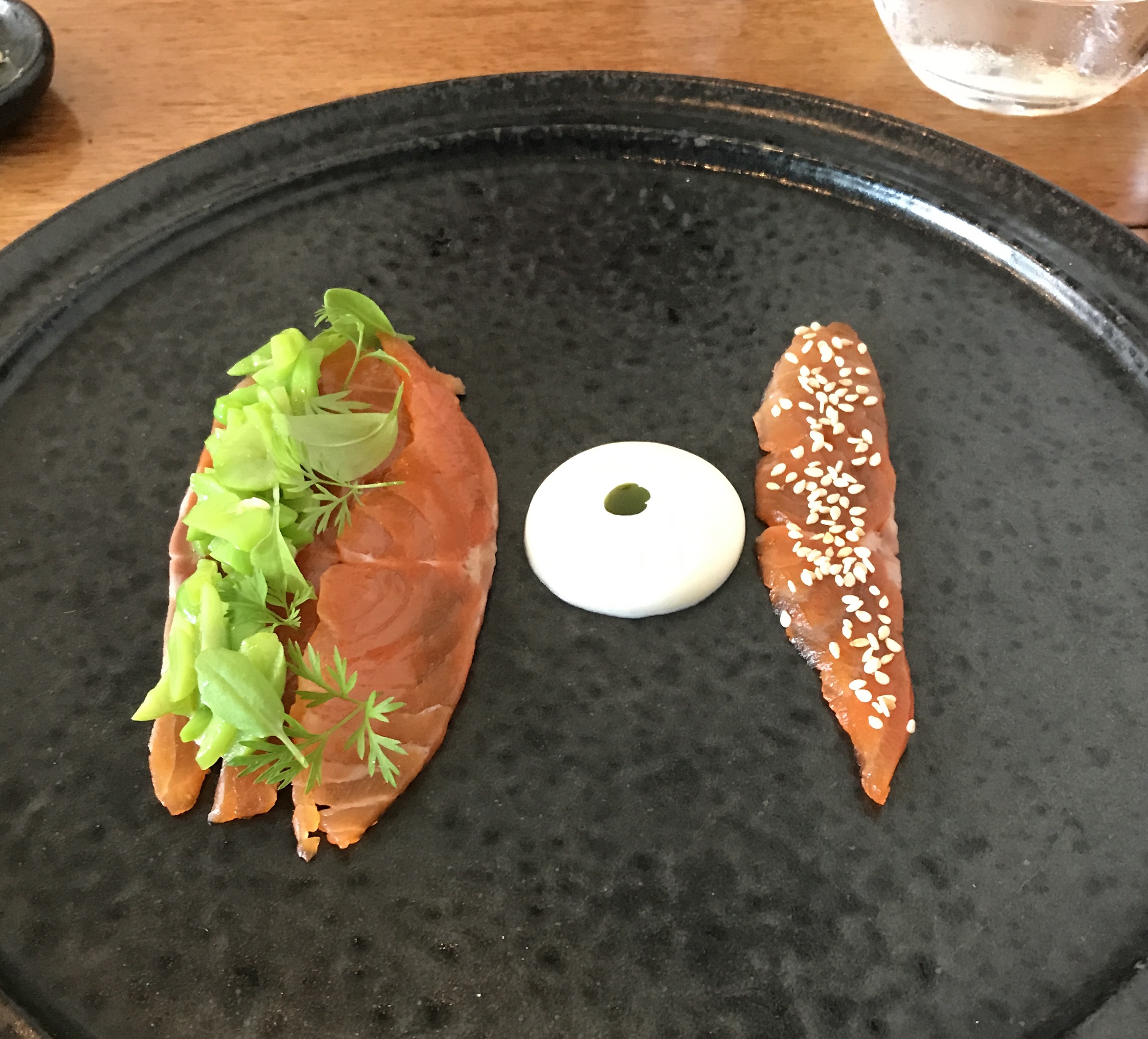 Paulo’s starter of sea trout cured in gomasio (a Japanese sesame salt) was served two ways. One piece featured leaves and broad beans whilst the other was topped with sesame seeds, bringing out the gomasio’s sesame flavour. A perfectly round globe of buttermilk sat between the two pieces of trout.