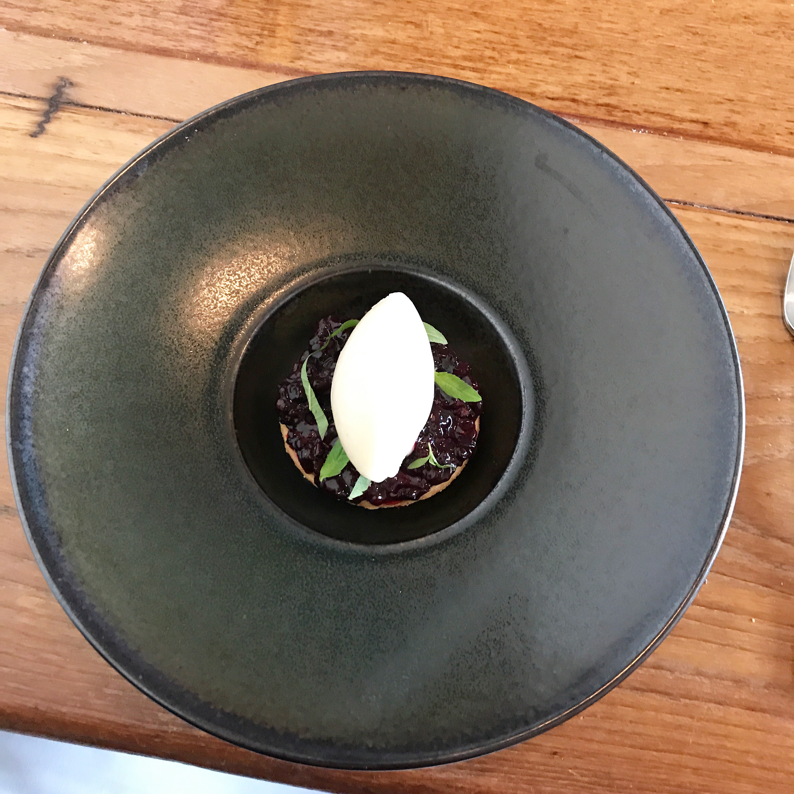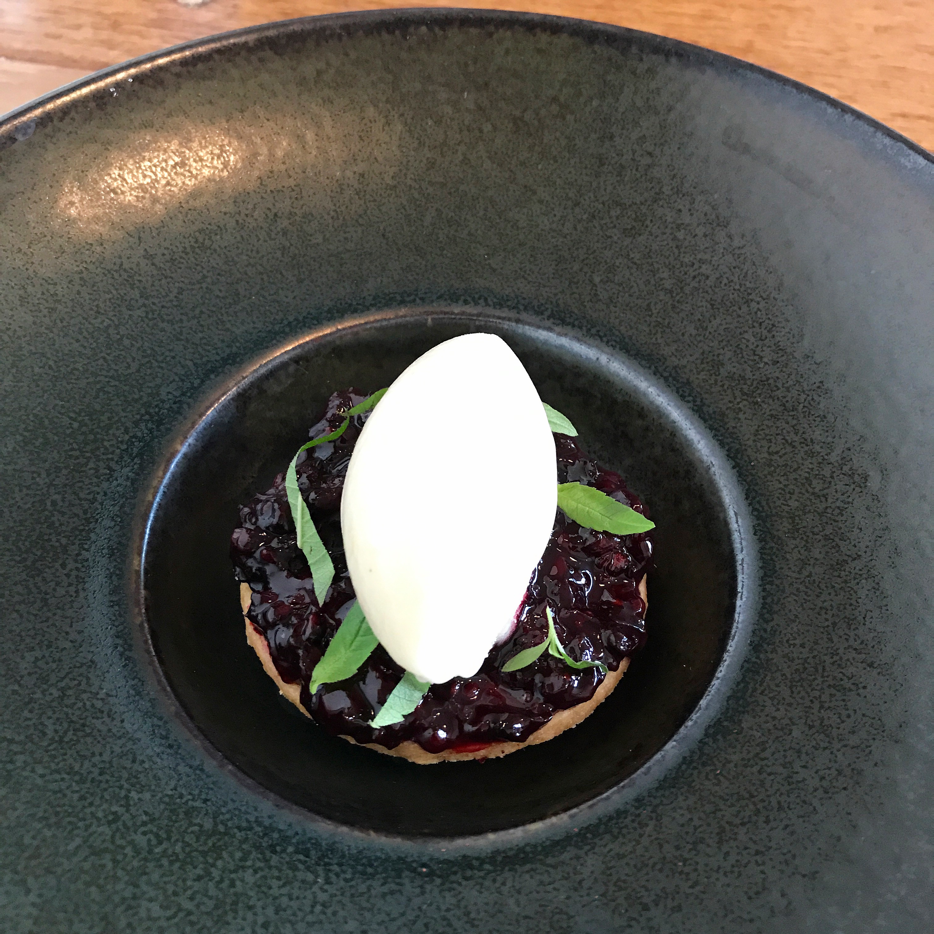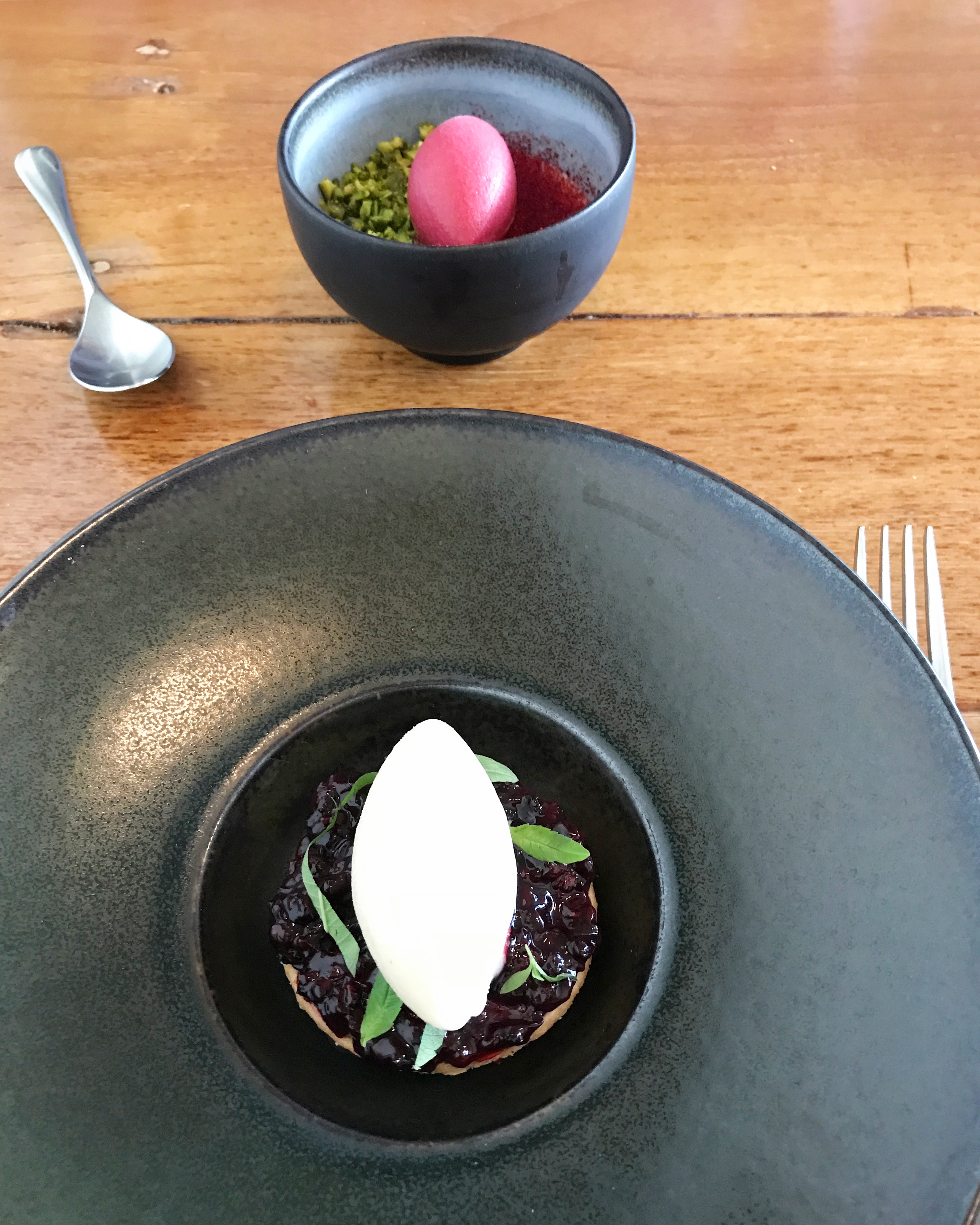 My dessert featured blackberry compote on a sablé biscuit topped with verbena and apple sorbet. The flavours were nicely balanced with the sweetness of the biscuit contrasting the tartness of the blackberry, apple and verbena.