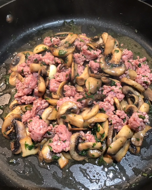 Add the mushrooms and sauté over medium-high heat. Crumble the sausages (with the casings removed) directly into the pan.