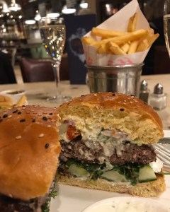 For my main course, I chose the lamb burger with whipped lemon feta, sweet chilli sauce, roasted red peppers, rocket, cucumber and red onion in a sesame bun, accompanied by tzatziki and fries.