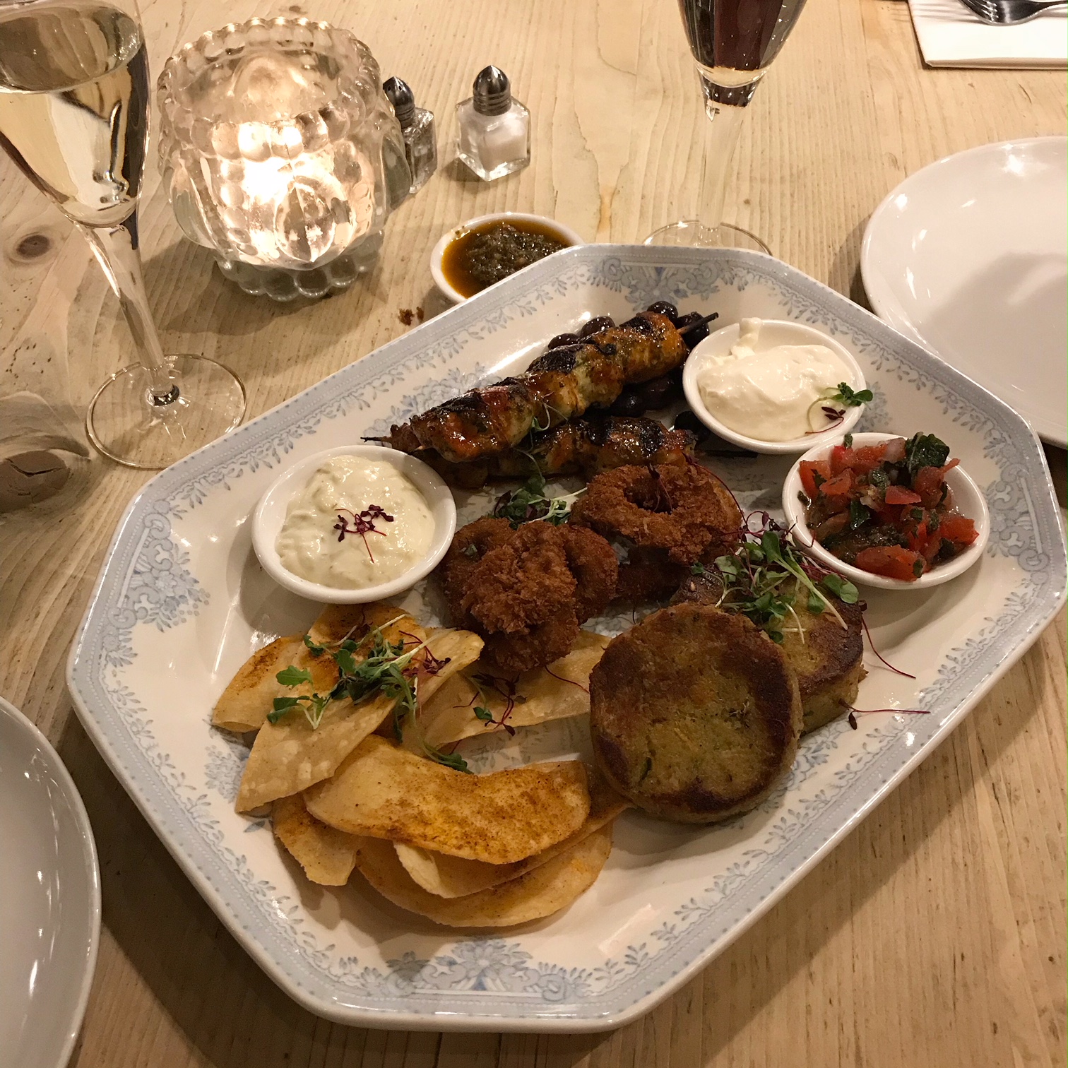 It took us a while to decide as the dinner menu had a lot of options, including a reasonably priced set menu available from noon to 7pm Monday to Friday. We chose from the main menu and decided to share a mezze platter featuring a selection of starters and sauces, namely spiced white corn tortillas, Dakkochi chicken skewers, calamari, crab cakes, olives, Pico de Gallo salsa, garlic & lemon mayo and tartare sauce. The mezze were served in a lovely blue and white platter to enhance the presentation of all the brown and beige food.