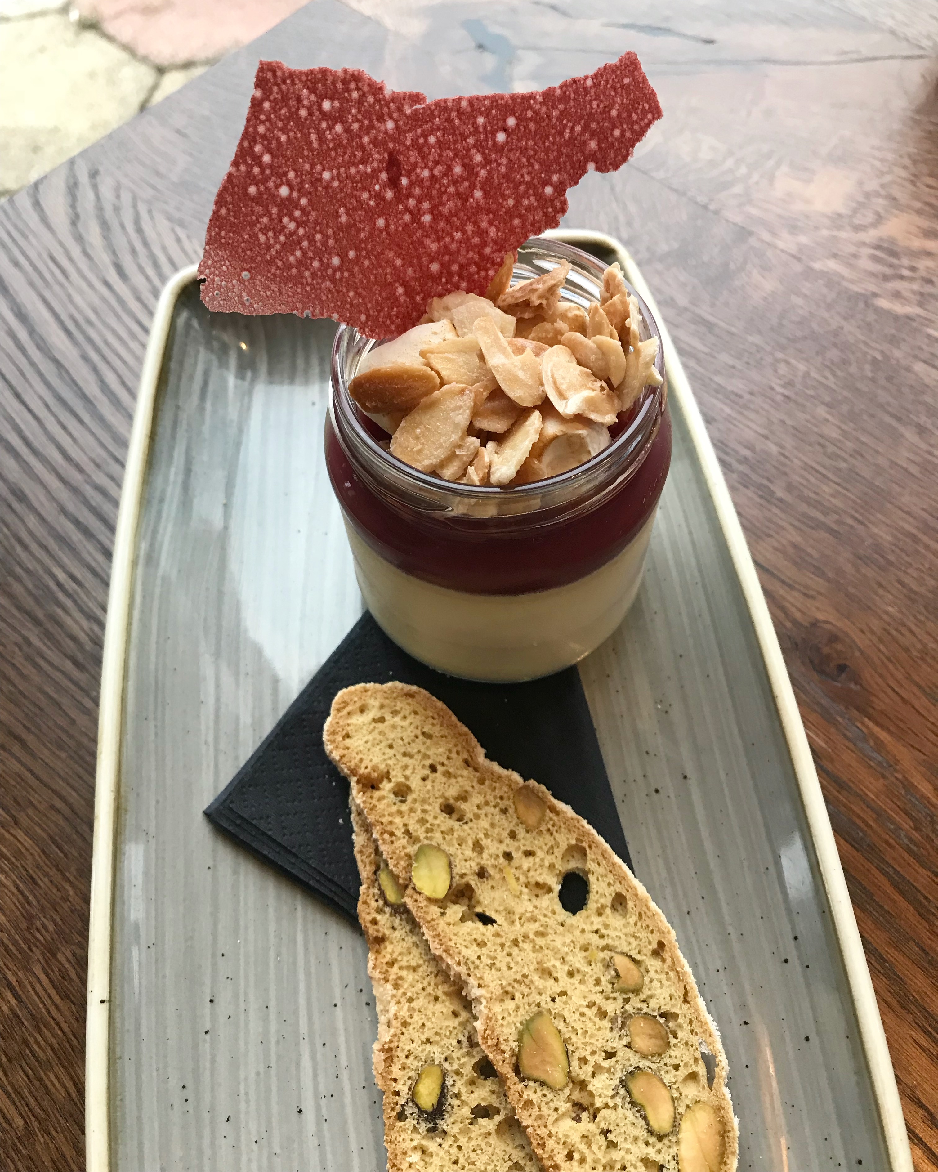 We couldn’t pass up the tantalising desserts. I ordered the baked cherry cream topped with praline and burnt meringue and served with thinly sliced pistachio biscotti, which I dipped into the pot. However, I did forget that praline is made of almonds. I don’t have an allergy but I am sensitive to almonds so I scooped them out and gave them to Paulo. It might be a good idea for the servers to mention that there are almonds in this dessert as it’s not specifically stated.