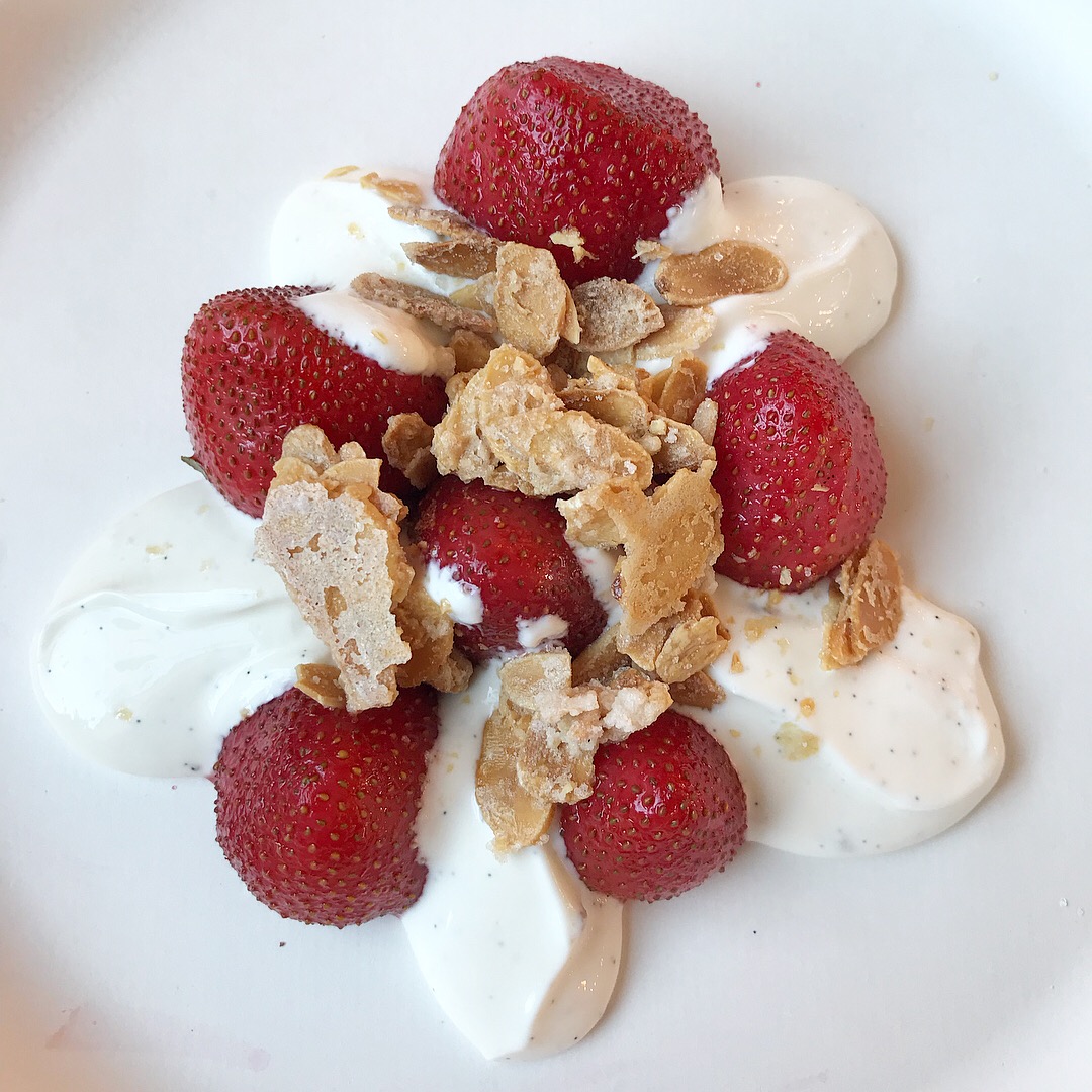 Local strawberries, sourced from Bury Lane Farm just outside Cambridge, were served with vanilla yogurt and topped with candied almonds. A great idea to offer something sweet as an alternative to cake. Of course we had both!