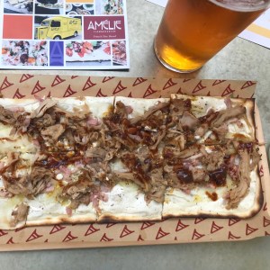 Paulo ordered the Pulled Pork variation with crème fraîche, sliced onions, smoked bacon, soy pulled pork, chilli and hoisin sauce. It was delicious too. The Flammekueche is served already sliced into squares to make sharing and eating easier. It can be messy to eat, especially with your hands (my preferred method), but napkins and cutlery are provided.