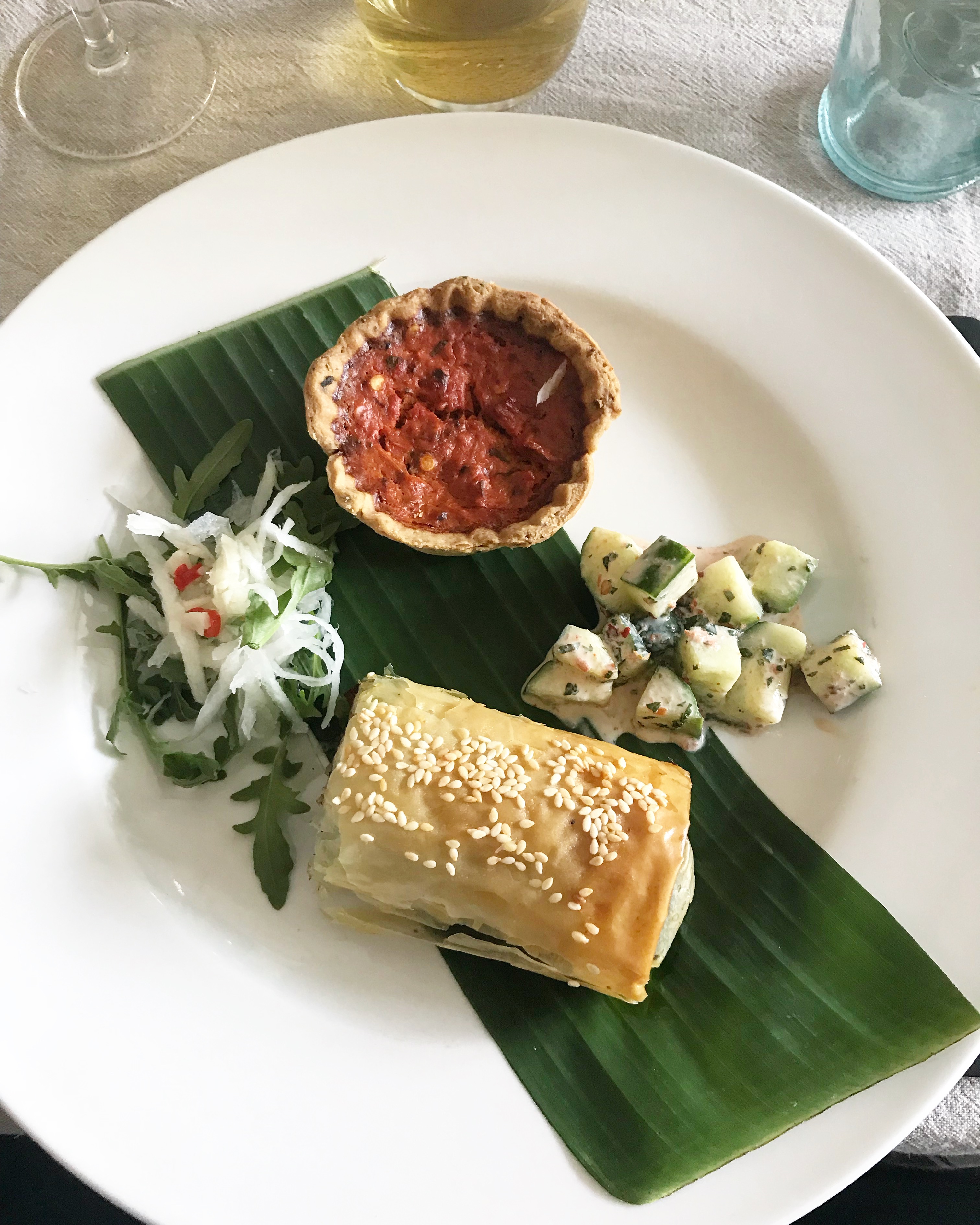 The first course was a savoury one, featuring two fusion pastries arranged on a banana leaf. The dishes were delicious. The Baking Jin can also cook! We enjoyed a roasted pepper and tomato sambal tart (Jin made the pastry from scratch) and beef rendang, which Jin wrapped in filo, effectively turning it into a giant spring roll. The beef was local (from Hereford cattle in Suffolk) and sourced from Mill Road Butchers. Side dishes included Chinese turnip and rocket in Thai salad sauce as well as a cucumber salad in sambal yogurt. I didn’t find the tart and rendang too spicy but the chillies on the cucumber salad were. Jin provided a bowl of yogurt with turmeric to cool our palates, if needed.