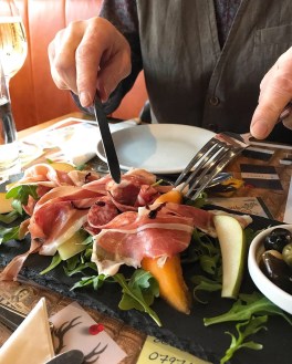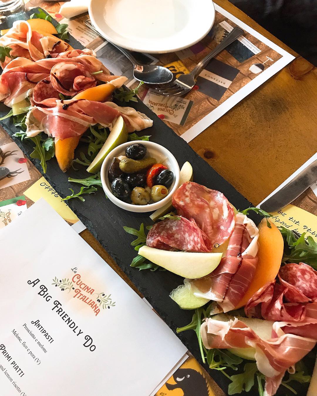 A cin cin and a clink of our wine glasses set the scene for the Italian delights to come, starting with gorgeous antipasti platters laden with olives, melon (cantaloupe, honeydew), rocket, prosciutto and salami (the cured meats were replaced with figs for the vegetarians).