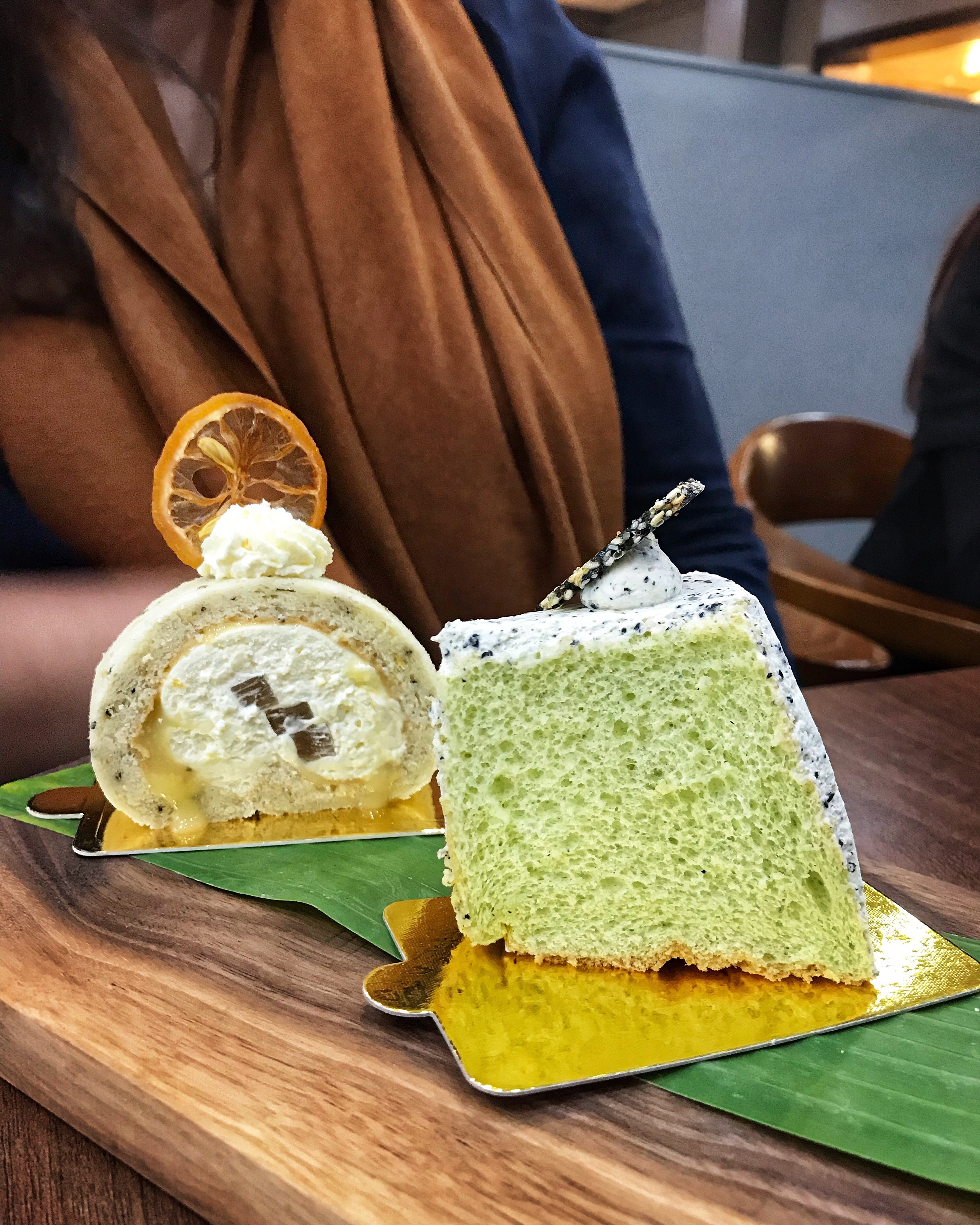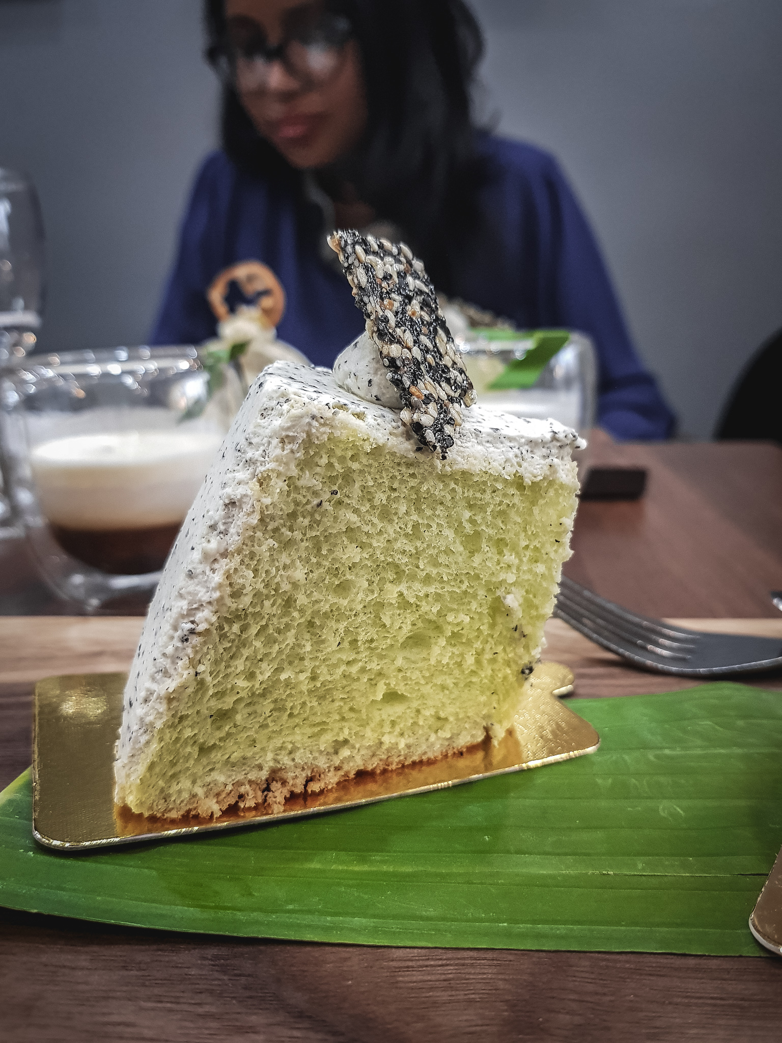 On the left sat a kuih (sweet dessert) called Seri Muka, which translates to “radiant face” – definitely my expression eating this kuih and smelling the sweet fragrance of the pandan leaf inserted at the top. The seri muka had a taste combination of sweet and savoury, a sticky texture and vibrant colours (natural extracts from pandan leaves and blue pea flowers), all forming three delicious layers of pandan custard (top), coconut glutinous rice (middle) and on the bottom, blue pea flowers grown in the garden of Jin’s late grandparents in Malaysia and picked and dried by his aunties. I tried Jin’s seri muka a few times before and it was served at his first Afternoon Tea (I wrote about it here). The texture takes some getting used to but I can’t get enough of it now!