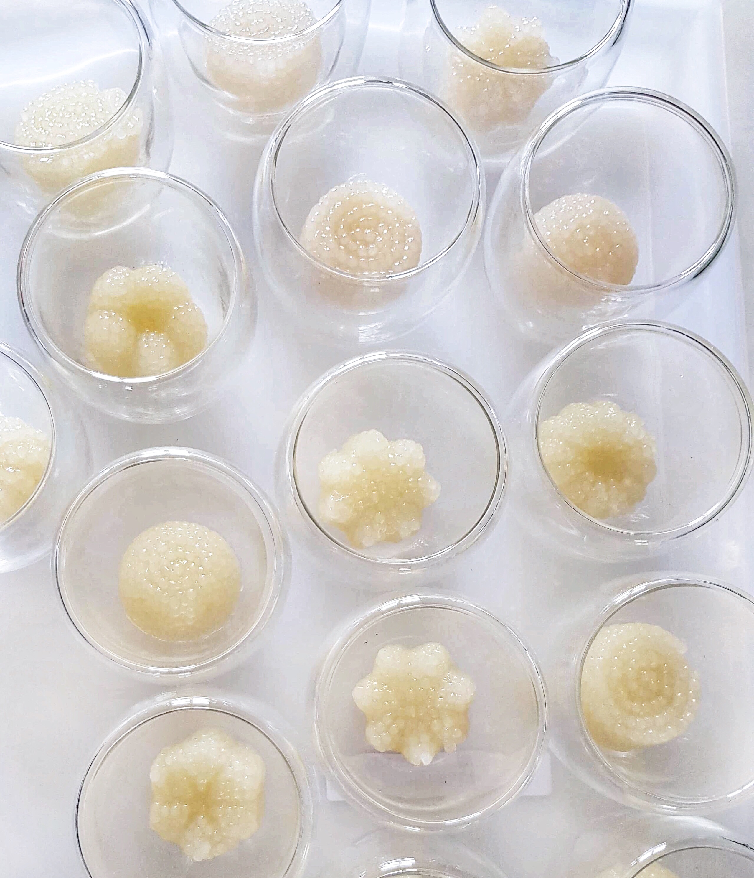 Jin’s third sweet treat was a traditional one. Gula Melaka Sago is the first dessert Jin’s mum taught him to make when he was 10 years old. It is a pudding made with gula melaka (palm sugar) syrup, coconut milk and sago pearls (a starch taken from the spongy centre of sago palm stems, similar to tapioca). The presentation was clever – it was reminiscent of a glass of Guinness but with a beautiful floating shape in it. Jin used jelly moulds to shape the sago into spirals or stars.