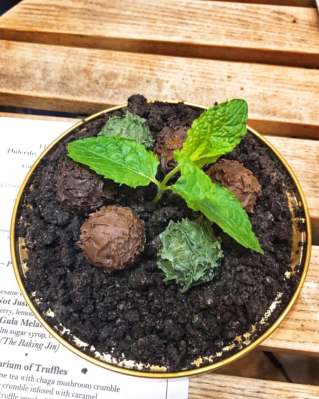 Riadh’s presentation of her Terrarium of Truffles was a reflection of her botany background: a glass terrarium housing three different conker-shaped truffles lightly buried in a fondant dark biscuit and finished with a mint leaf. The terrariums were even served with white gloves to eliminate fingerprints.