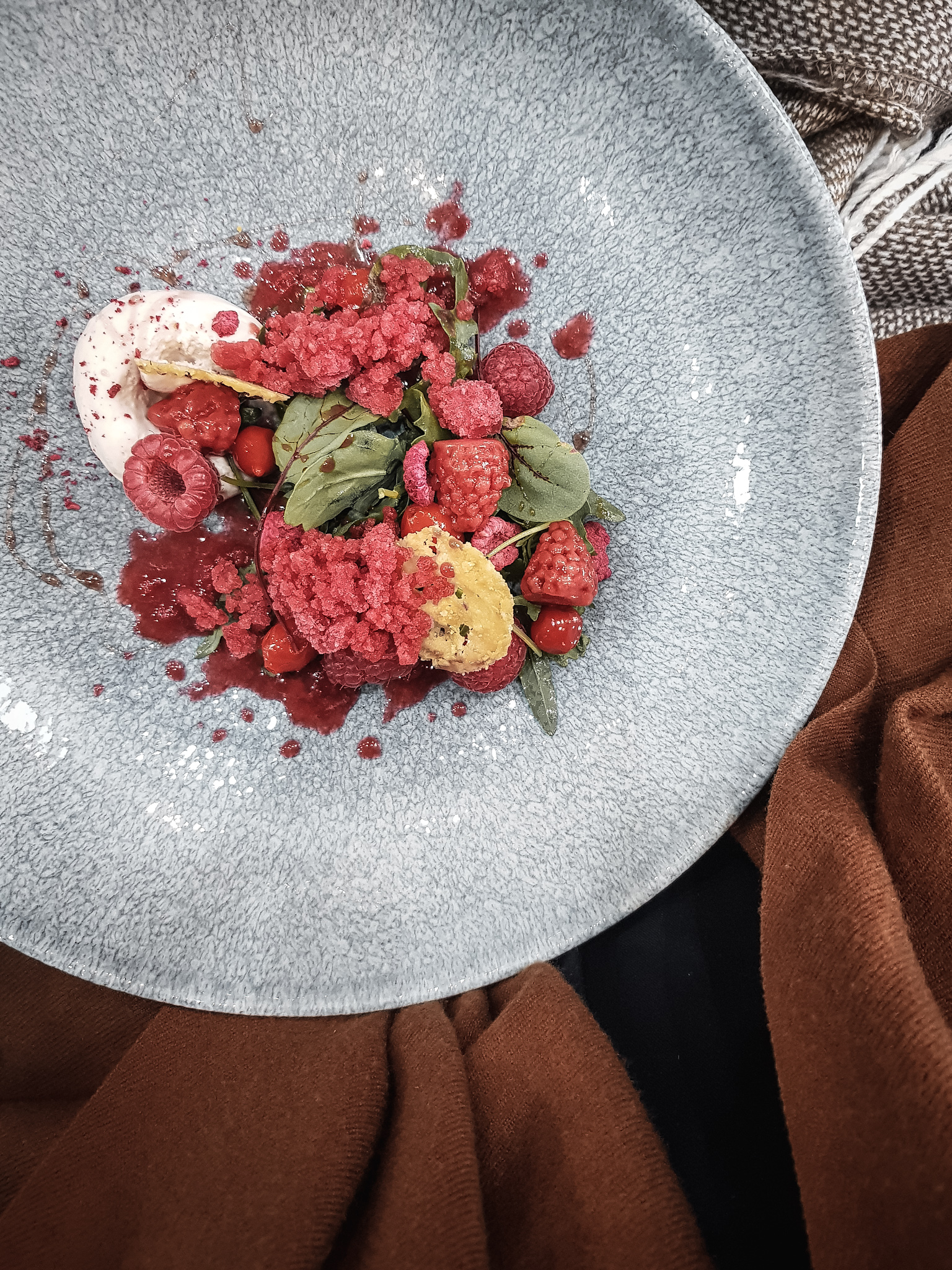Andrew’s next course provided a refreshing break with fresh and frozen raspberries, sweet drop peppers, a cream mousse with a touch of raspberry, red vein sorrel and Parmesan crisps. The cold raspberries made the dish a sort of palate cleanser, complemented by sweet, earthy and salty flavours. Absolutely delicious!