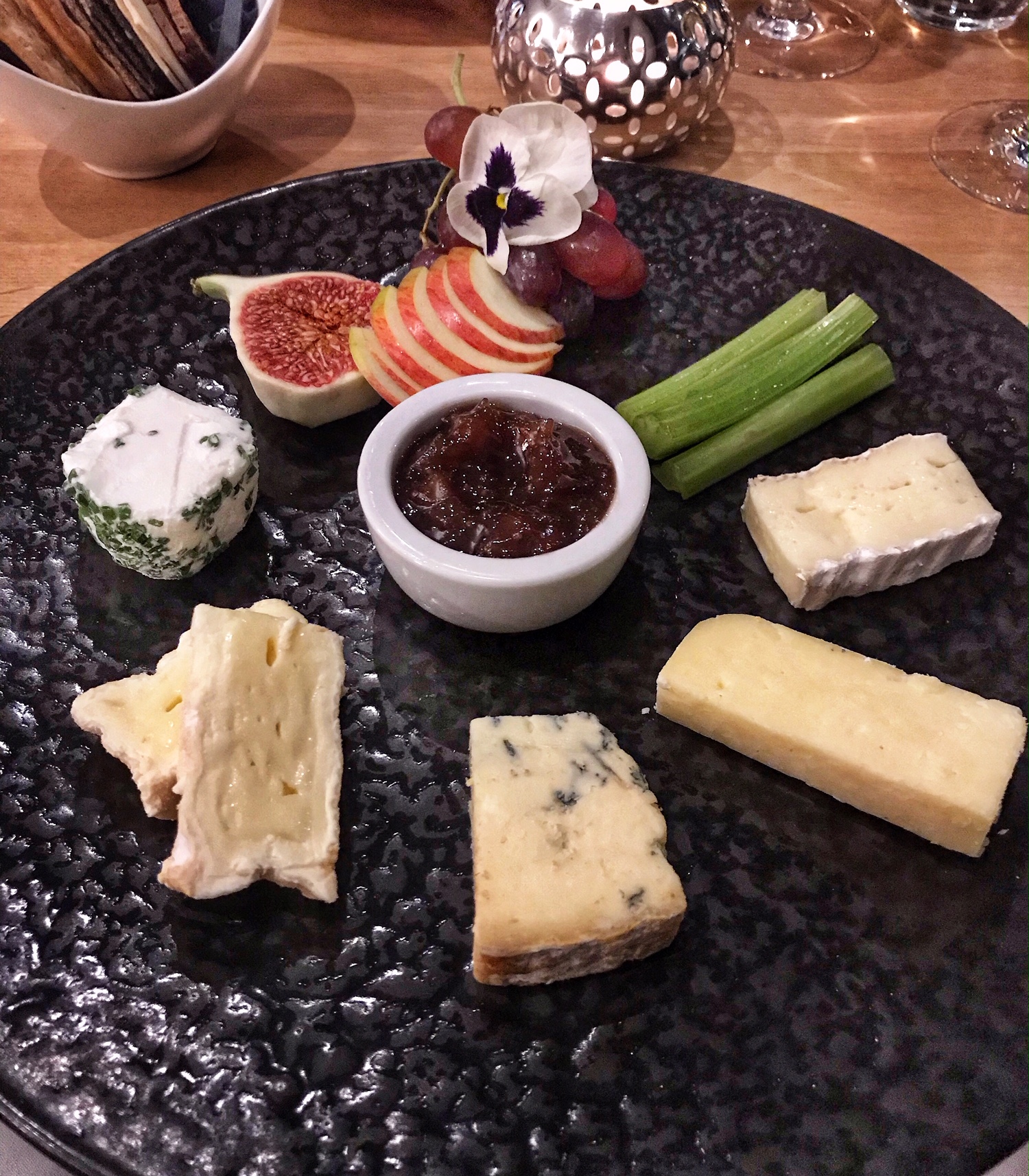 For dessert, Paulo went for the British cheese selection, featuring Cave Aged Vintage Barber Cheddar, Wobbly Bottom Goat, Baron Bigod, Cropwell Bishop Stilton and Oxford Isis, served with grapes, fig, celery, apple and plenty of crackers.