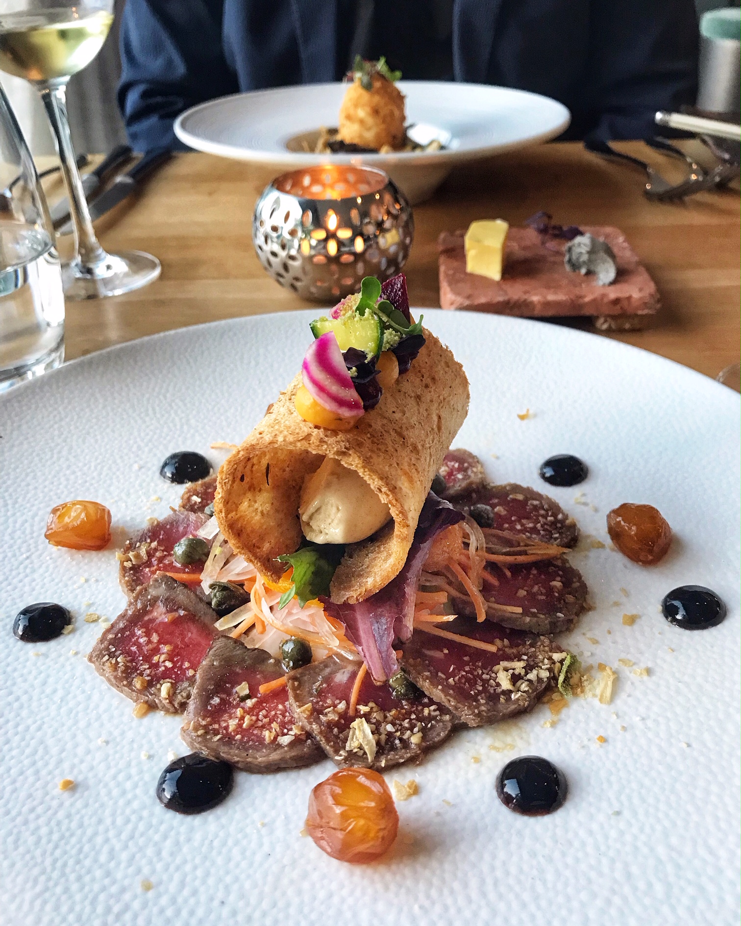 We mentioned that we were dining at the restaurant so we were given the menu to peruse whilst relaxing with our drinks. Our amuse-bouche was also served to us in the bar. The salmon tartare and trout caviar, accompanied by duck liver pâté in a little round sandwich, got our taste buds tingling.