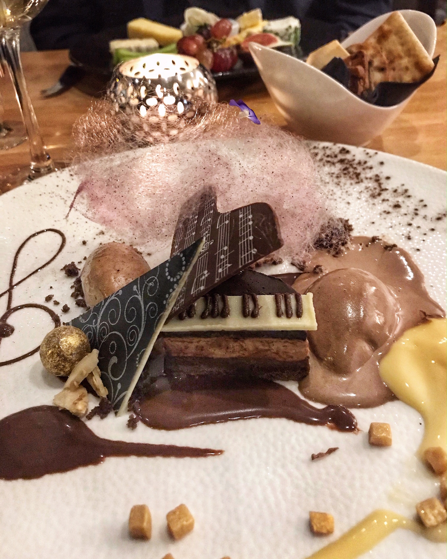 Although I was tempted by the choice of incredible desserts, I couldn’t resist Hans Schweitzer’s pièce de résistance I enjoyed so much in the past – The Chocolate Piano Composition from Single Plantations. This veritable work of art, originally created in Pavarotti’s honour during Hans’ time at Sandy Lane Hotel in Barbados, is a permanent fixture on Cotto’s menu. It has to be… there would be an uproar if Hans ever removed it! I noticed that the dessert varies in presentation, which keeps diners intrigued and the chef creatively motivated. The delicious cloud of spun sugar that seemed to float above the instrument was new to me but the chocolate piano was still as expertly made and finely detailed as usual. The ultimate experience for chocolate lovers!