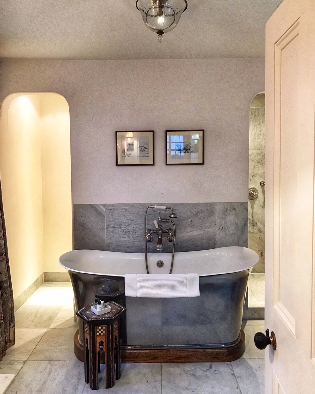 The bathroom was as big as the bedroom and quite spectacular with marbled double sinks, a free-standing tub and a walk-in shower.