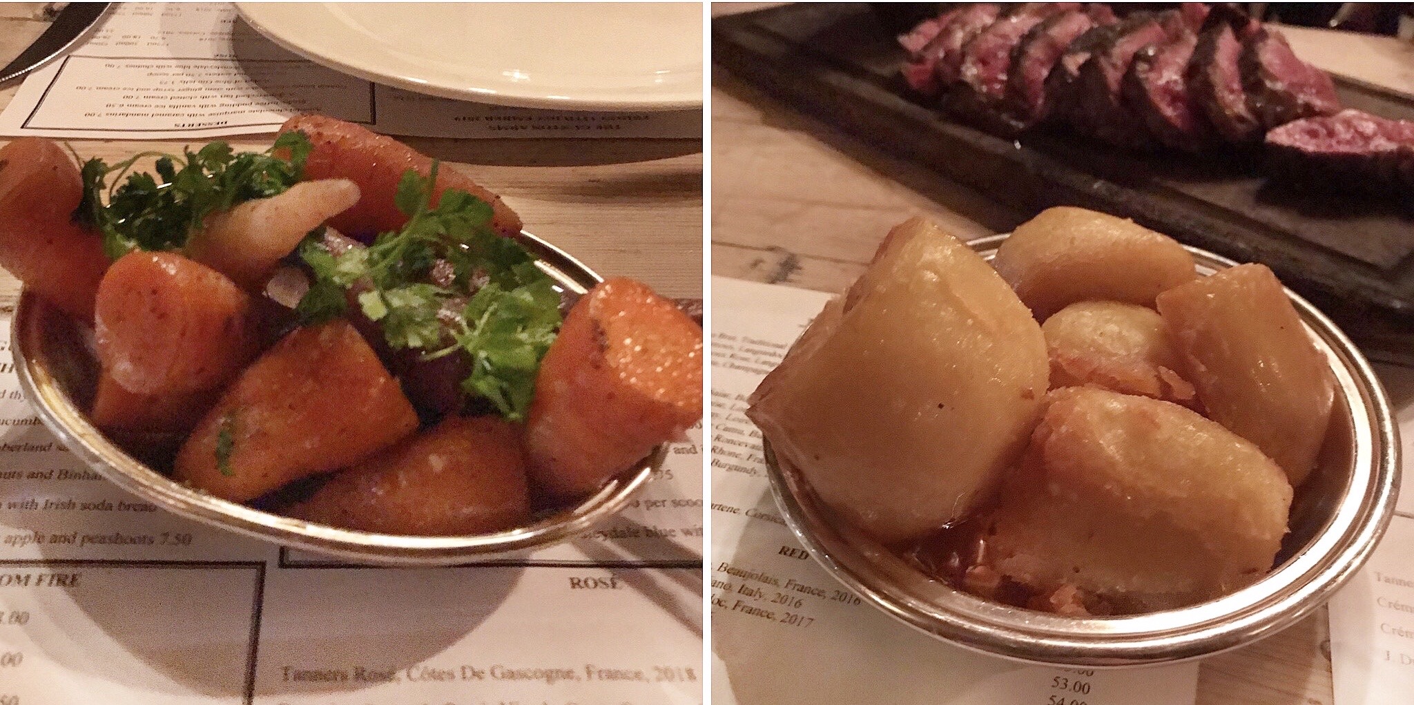 Our dishes were served with Albert Bartlett goose fat roast potatoes. They were soft and fluffy on the inside but super crispy on the outside from being finished off on the fire. We also ordered a side of heritage Chantenay carrots with chervil.
