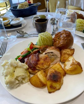 The Sunday Lunch menu featured several tempting dishes for the main course. I enjoyed the Supreme Breast of Guinea Fowl wrapped in Pancetta with Sage & Shallot Stuffing.