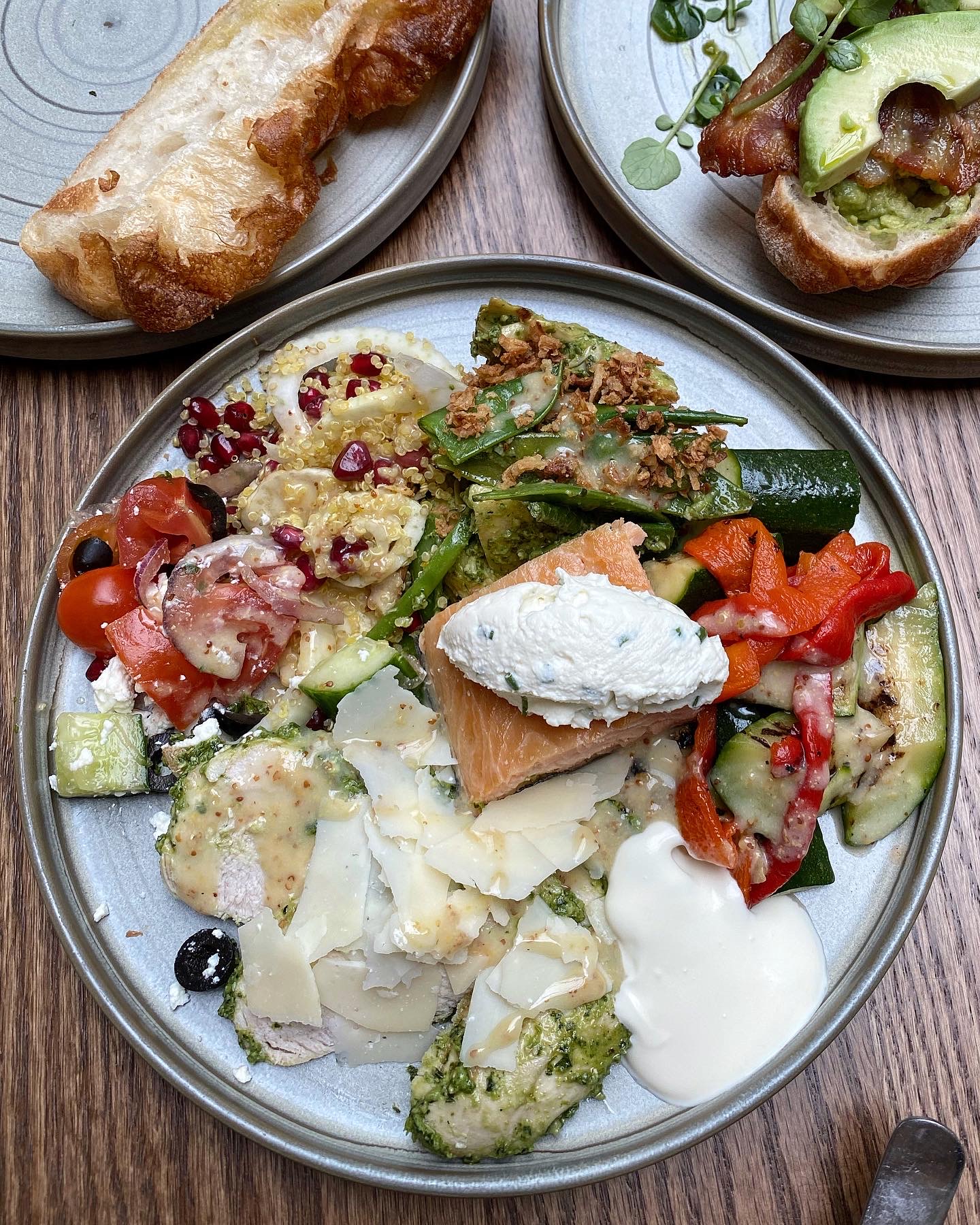 For a nutritious and filling lunch, their Ottolenghi-style Courtyard Plates menu features one choice of main (Roast Suffolk Chicken Breast, Hot Smoked Salmon or Aubergine & Tomato Tart) with a whopping three salad choices, including Fine Beans Salad, Sweet Potato Salad, Greek Salad, Fennel & Pomegranate Quinoa, Grilled Courgette & Roasted Pepper and Green Leaf Salad. Our sample plate included several of these options. All delightful!