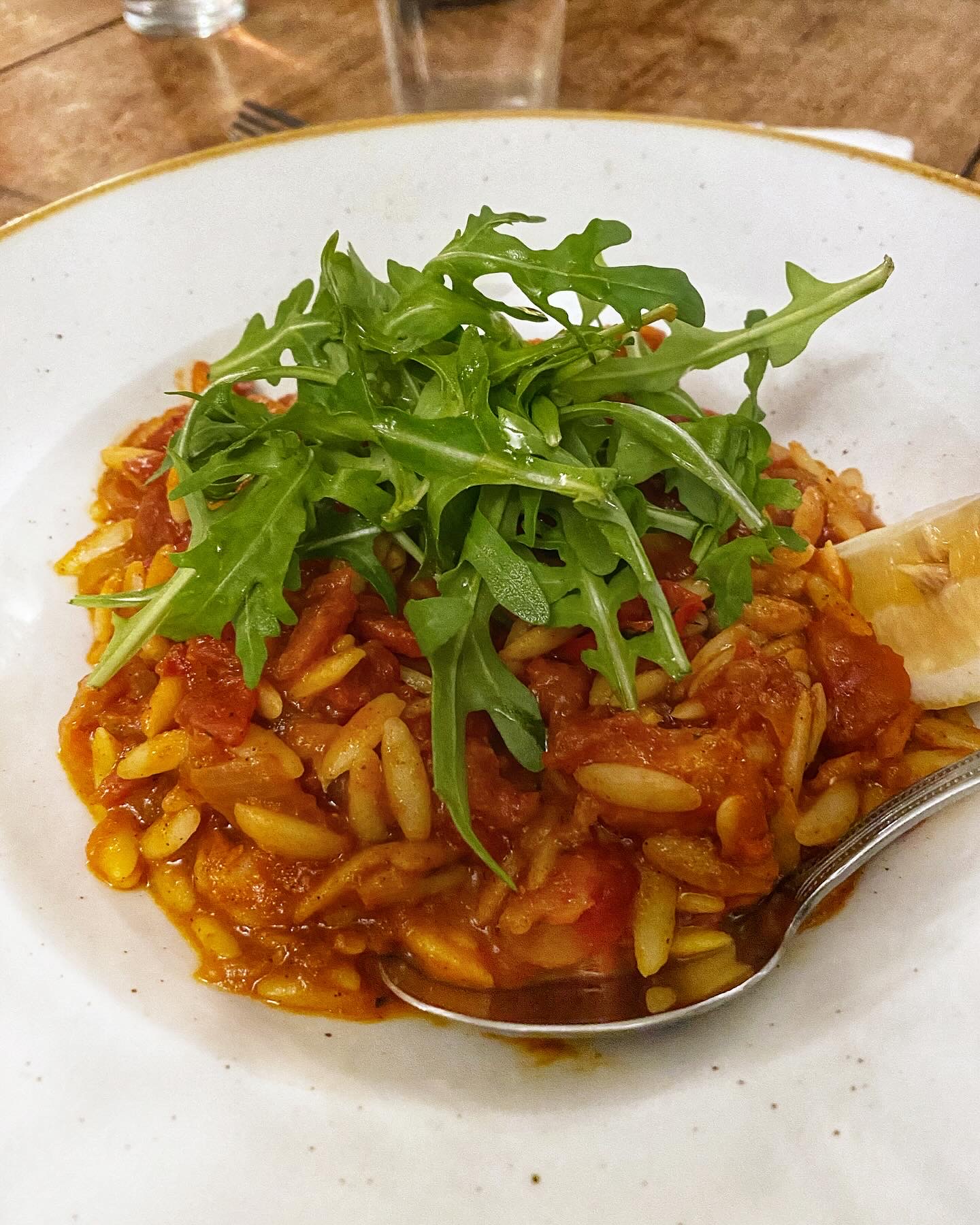 King prawn saganaki – orzo with king prawns cooked in a tomato, ouzo and feta sauce with a hint of chilli, served with rocket.