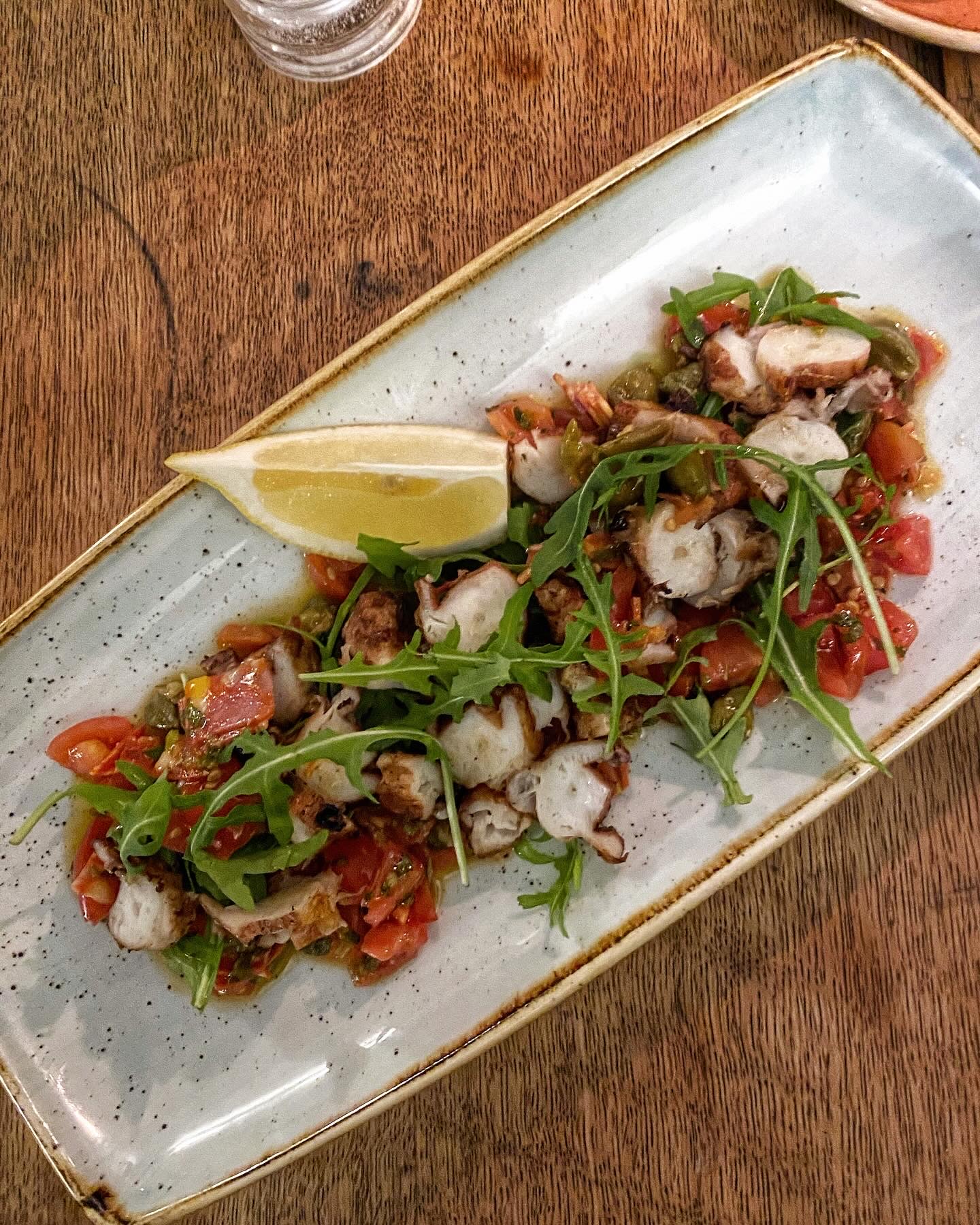Octopus carpaccio, served with a tomato, chorizo and caper salsa.