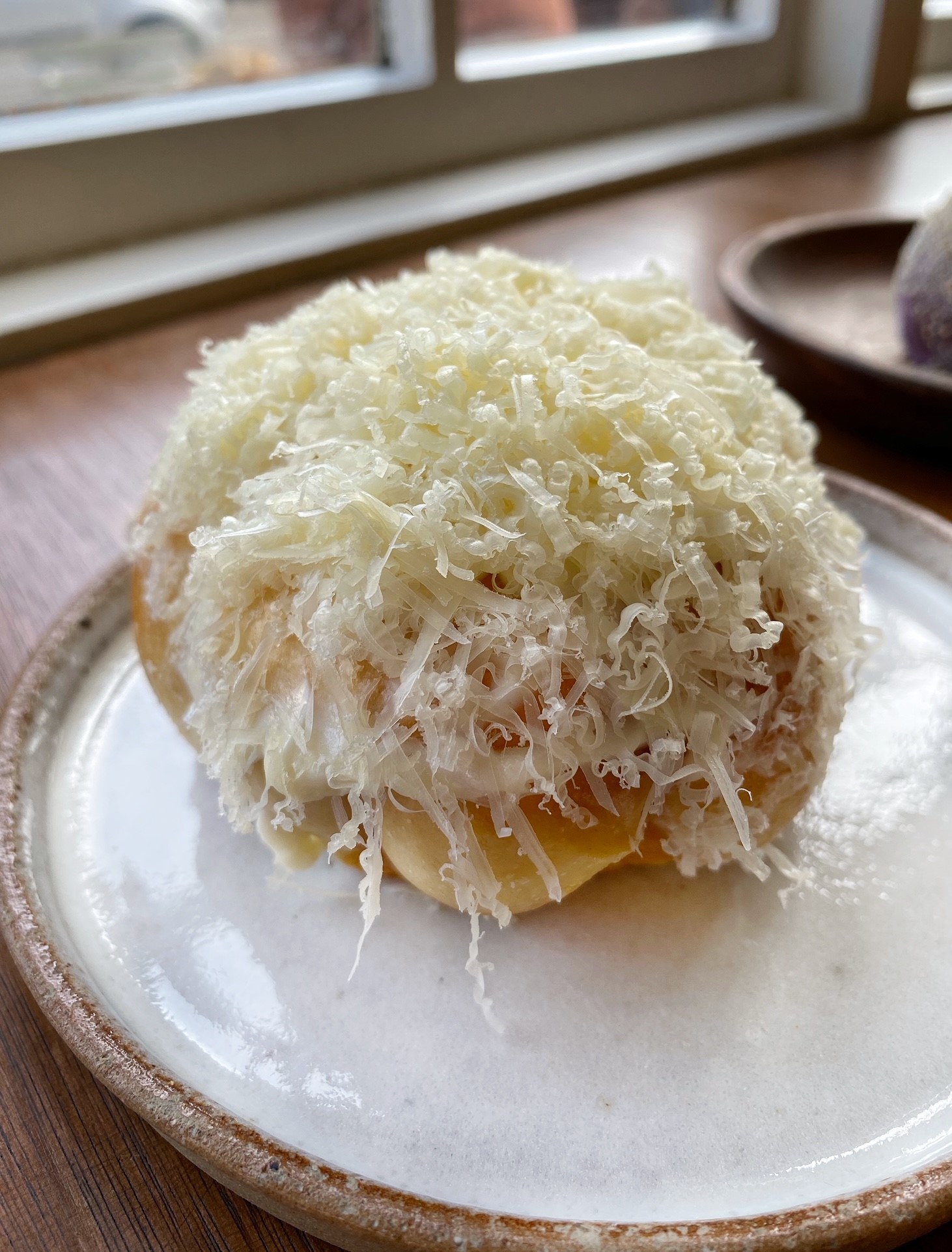 Ensaymada – brioche with cheddar and buttercream, dusted with sugar and topped with grated edam cheese