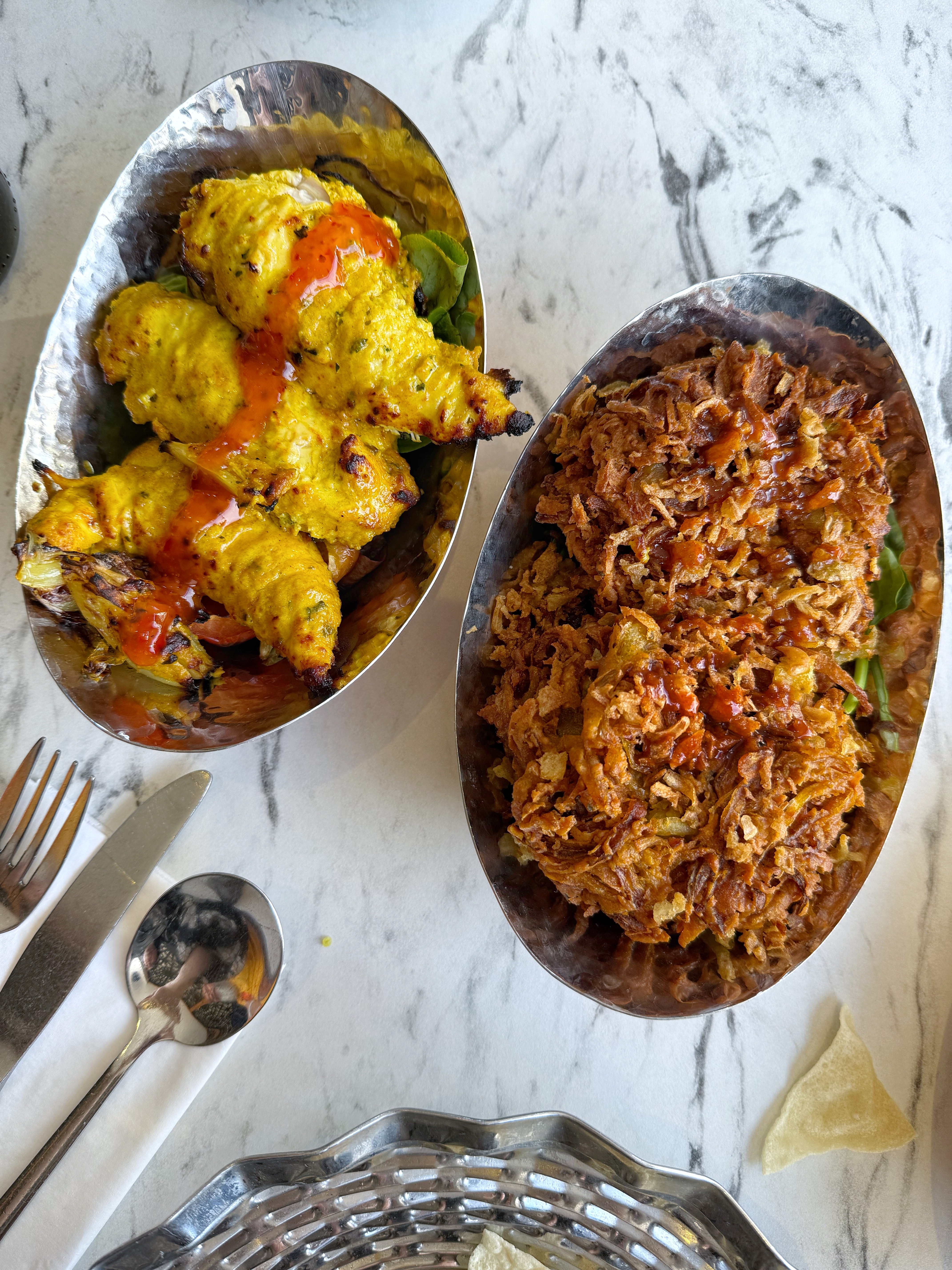 Onion Bhajee (they’re huge!) and Alvi’s Specials (delicately spiced succulent chicken that has been skewered and grilled).